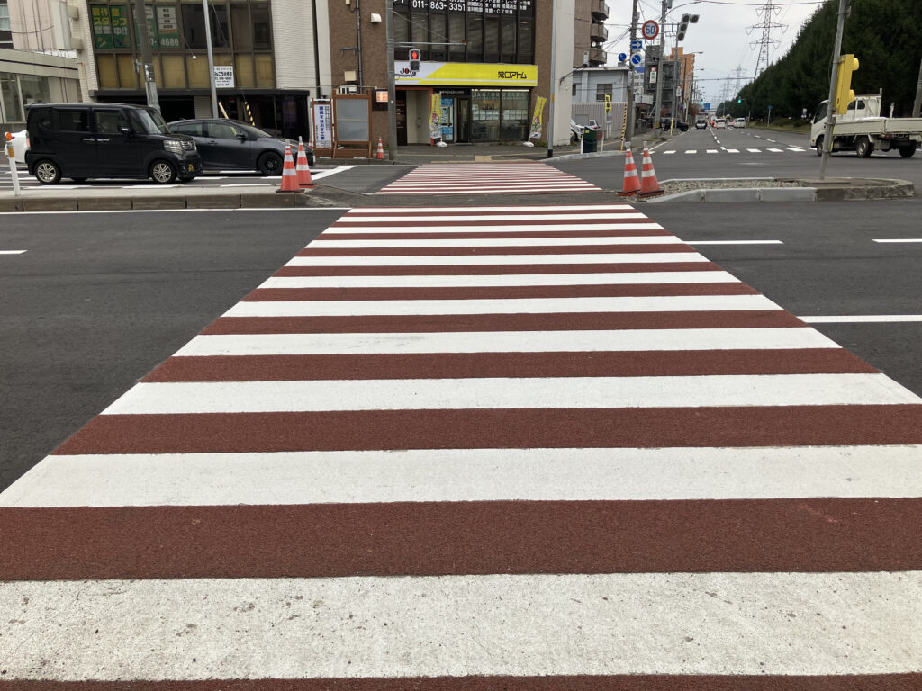 路面が赤みがかったエンジ色になっている横断歩道を見かけたことはありますか。表面が少し粗く、ザラザラとした質感が特徴です。